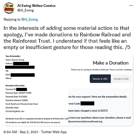 The storied Marvel writer then informed his followers that, “In the interests of adding some material action to that apology, I’ve made donations to Rainbow Railroad and the Rainforest Trust. I understand if that feels like an empty or insufficient gesture for those reading this.”