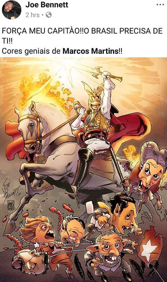 The artwork in question, posted to Facebook by the Brazillian artist himself in 2017, depicts the current Brazillian president as a sword wielding military general in shining armor, wielding a shining sword and riding astride a flaming horse, chasing down and beheading rat-like representations of his political opponents, including (as identified by Bleeding Cool) former Brazilian Presidents Dilma Rousseff, Michel Temer, and Luiz Inácio da Silva, as well as Senator Aécio Neves.