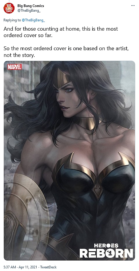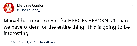 “Marvel has more covers for HEROES REBORN #1 than we have orders for the entire thing,” said Big Bang Comics in a post to their official Twitter account, brought to Bounding Into Comics’ attention on Twitter by @The_NinjaKnight. “This is going to be interesting.”