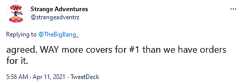Big Bang Comics was not alone in their variant-cover order discrepancy, as the same phenomena was reported by both award-winning Canadian comic book franchise Strange Adventures, who responded to their Irish peer’s tweet with the similar confirmation that there are “WAY more covers for #1 than we have orders for it”: