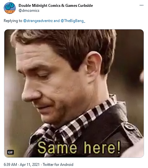 And popular New Hampshire comic book store Double Midnight Comics & Games, who replied to Big Bang Comics’ initial tweet with a gif of actor Martin Freeman, in the role of Dr. John Watson in the BBC Sherlock series, shaking his head and exclaiming “Same here!”