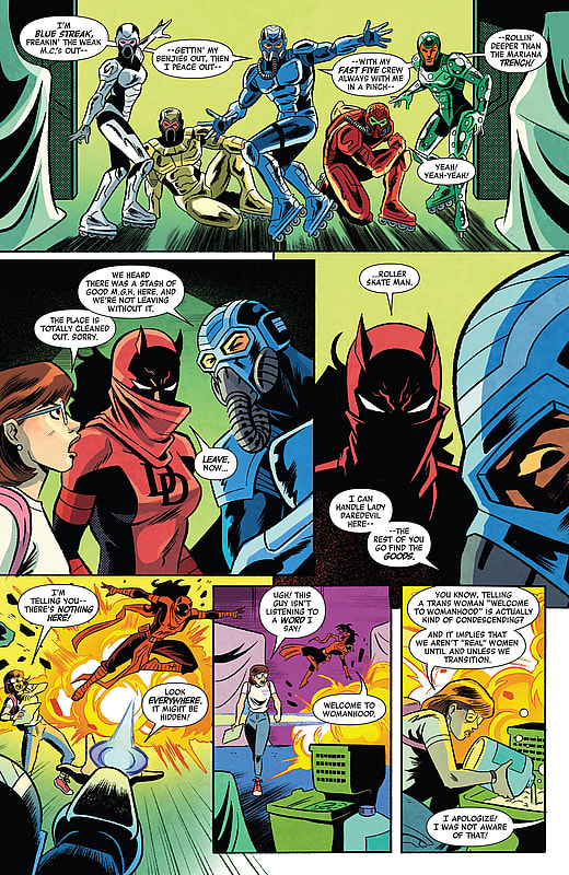 However, before the two can converse any further, they are soon interrupted by z-list roller blading supervillain team Fast Five, who have arrived at the lab of their own accord in an attempt to steal its stash of MGH.