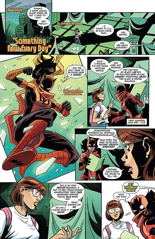 Beginning with Elektra stumbling upon the Immortal Hulk’s Dr. Charlene McGowan trespassing in one of Wilson Fisk’s old Mutant Growth Hormone manufacturing sites, the story then sees the femme fatale confront McGowan on their reasons for accessing the lab, only for the scientist to reveal that the individual is a transgender woman seeking to use the leftover technology “to help trans women manufacture their own hormones without taking pills every day.”