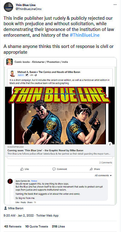 One publisher, Apex Comics out of the United Kingdom insinuated Baron was a racist for the title of the graphic novel. In a comment in a Facebook group, the publisher responded to Baron promoting the campaign writing, “Would never support this. It’s one thing to show cops, but the Blue Line has shown itself to be a racist movement that seeks to protect corrupt cops from justice and supports institutional racism.”