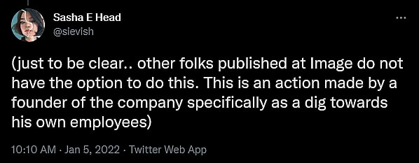 In a follow-up tweet, Head clarified, “just to be clear.. other folks published at Image do not have the option to do this. This is an action made by a founder of the company specifically as a dig towards his own employees.”