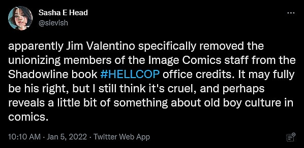 The removal was then brought to widespread attention by former Image Comics production sales & marketing production designer Sasha E. Head, who tweeted that same day, “apparently Jim Valentino specifically removed the unionizing members of the Image Comics staff from the Shadowline book #HELLCOP office credits.”