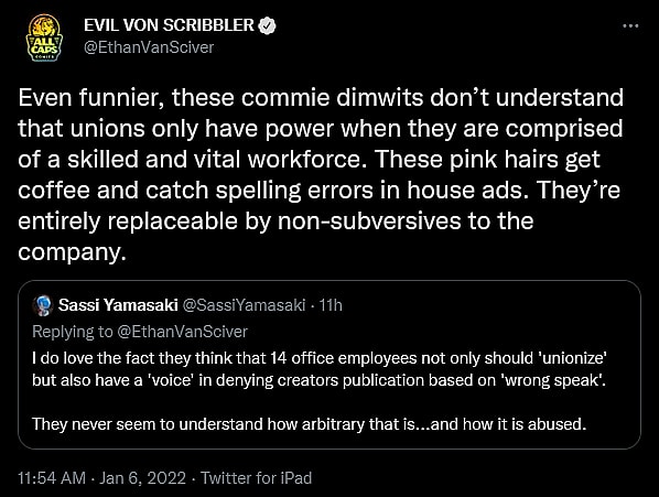 Responding to a fan who found it humorous how those of a similar mindset to the unionizers “never seem to understand how arbitrary that is…and how it is abused,” Van Sciver asserted, “Even funnier, these commie dimwits don’t understand that unions only have power when they are comprised of a skilled and vital workforce.”