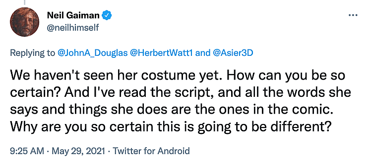 “We haven’t seen her costume yet. How can you be so certain?”, asked Gaiman in reply. “And I’ve read the script, and all the words she says and things she does are the ones in the comic. Why are you so certain this is going to be different?”