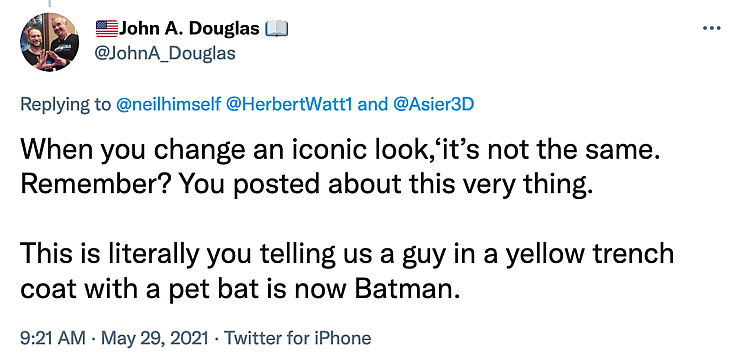 Inevitably, Gaiman’s own words concerning the pitfalls of making changes to beloved franchises were cited against him, as @JohnA_Douglas noted, “When you change an iconic look,‘it’s not the same. Remember? You posted about this very thing.”
