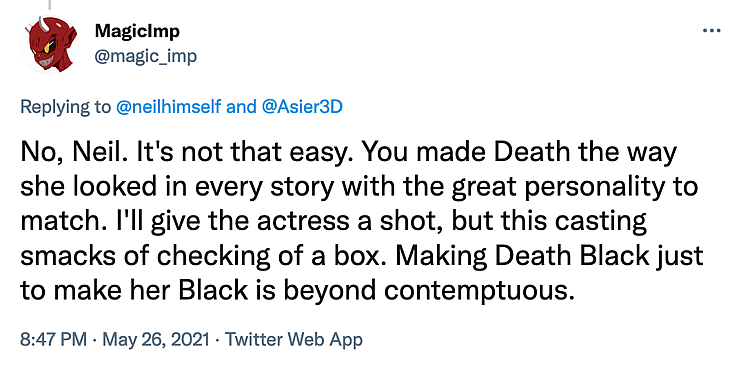 “You made Death the way she looked in every story with the great personality to match,” said @magic_imp. “I’ll give the actress a shot, but this casting smacks of checking of a box. Making Death Black just to make her Black is beyond contemptuous.”