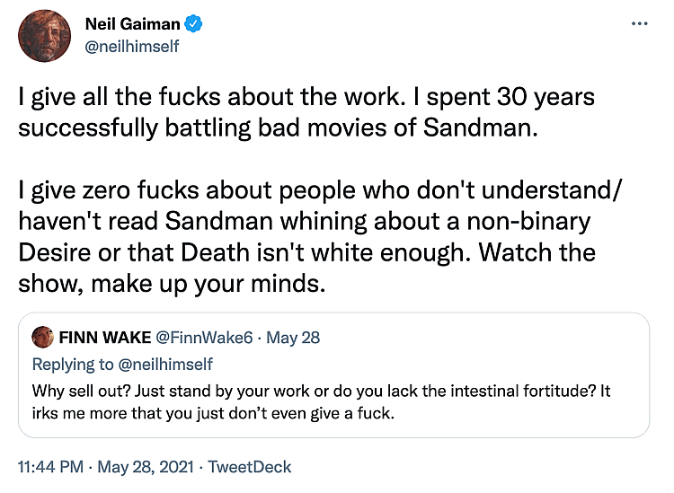Gaiman responded, “I give all the f–ks about the work. I spent 30 years successfully battling bad movies of Sandman.”