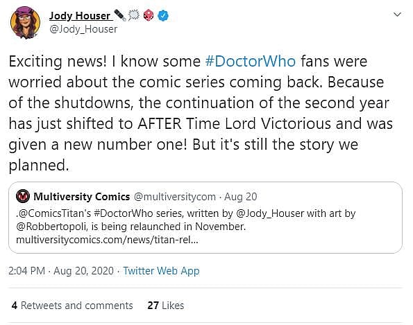She wrote, “Exciting news! I know some #DoctorWho fans were worried about the comic series coming back. Because of the shutdowns, the continuation of the second year has just shifted to AFTER Time Lord Victorious and was given a new number one! But it’s still the story we planned.”