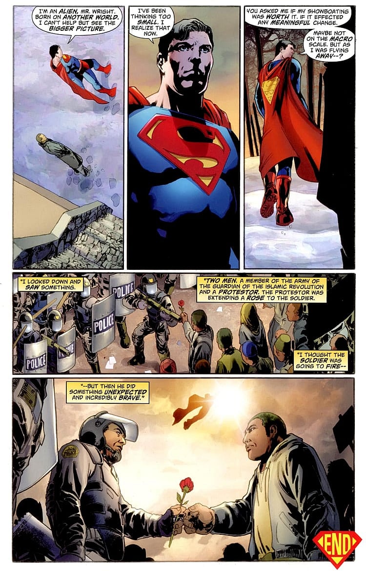 In the first issue of the newly-launched series Superman: Son of Kal-El, writer Tom Taylor strikes “the American way” from the hero’s famous, time-honored line in favor of “Truth, justice, and a better world.”