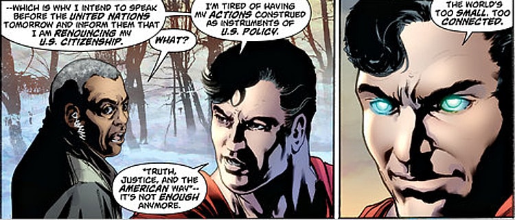 Superman even renounced his American citizenship in the comic books during the 2011’s “The Incident,” an Action Comics #900 backup story written by Man of Steel and Dark Knight scribe David Goyer.