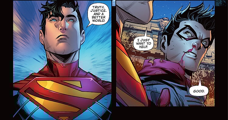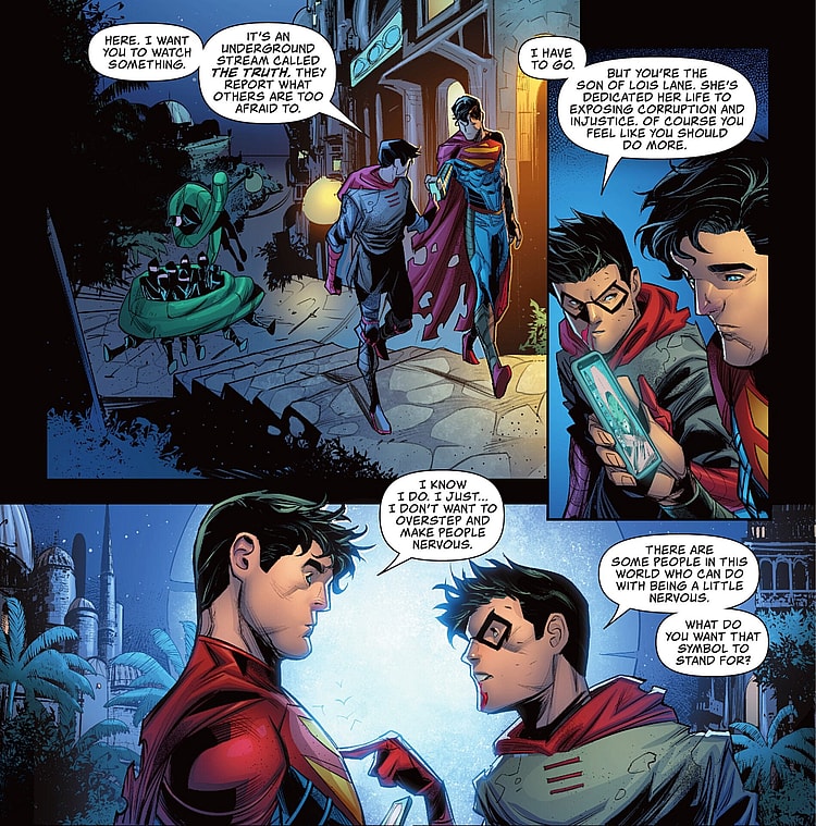 Source: Superman: Son of Kal-El Vol. 1 #1 "Truth, Justice, and a Better World" (2021), DC Comics. Words by Tom Taylor, art by John Timms AND Gabe Eltaeb.