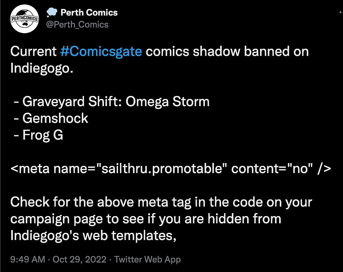 Comic creator Perth Comics researched IndieGoGo’s code and found that some campaigns were embedded with code “<meta name=”sailthru.promotable” content=”no” />”, which doesn’t allow the campaigns to be searched for. He found this code also impacted the campaigns Gemshock and Frog G.