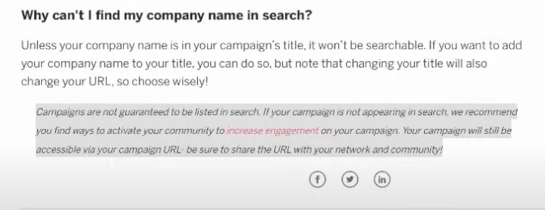IndieGoGo’s help center confirms it intentionally shadowbans campaigns and can do so for any reason. The page states, “Campaigns are not guaranteed to be listed in the search. If your campaign is not appearing in search, we recommend you find ways to activate your community to increase engagement on your campaign. Your campaign will still be accessible via your campaign URL- be sure to share the URL with your network and community!”