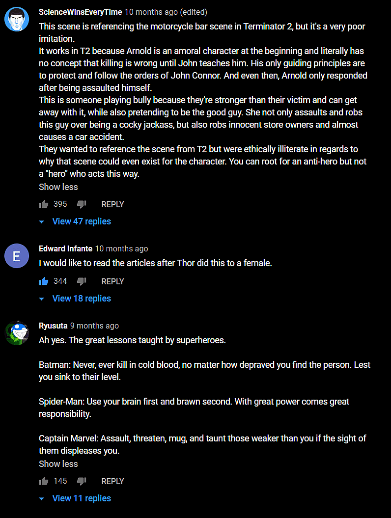Regardless of the ideology’s contradictions, it’s imposed on our modern comics. So, what happens when this redistribution of power, to validate the abolition of objective facts and morals, is imposed on heroes, who abide by classical narrative archetypes and virtues? Simple: heroes become anti-heroes, at best, and villains, at worst. The imposing of a subjective view of the world, believing it’s a better one, on the world, by force, is the role of a villain. It suddenly becomes permissible to retaliate to speech with violence, because criticism is an attack on your subjective interpretation; and therefore your identity; and therefore you. Speech paradoxically becomes violence. “New” postmodern heroes redefine justice as ‘the redistribution of power,’ and engage in, disproportionate retributive violence for even the slightest of infractions (as seen in Roxane Gay’s She-Hulk comics, or the deleted scene from 2019’s Captain Marvel).