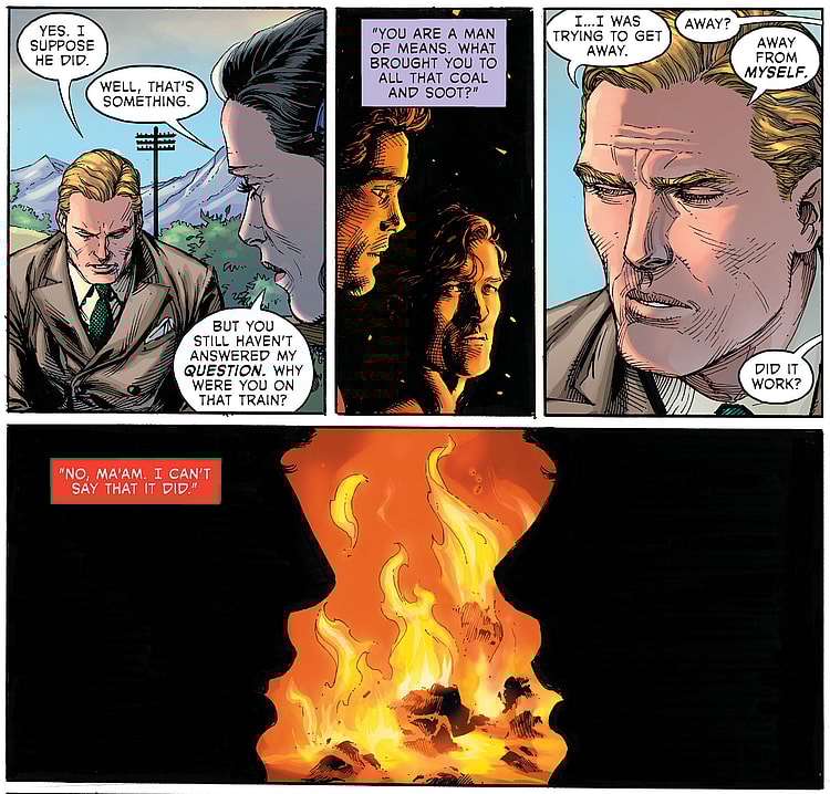 In the issue, Scott speaks with Doris Henton, the mother of a young man named Jimmy, a friend and co-worker of Scott’s who died in a train accident as the result of industrial sabotage. While telling her of her son’s fate, Scott states that he was on the train in order to get “away from myself.”