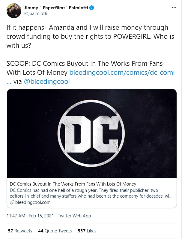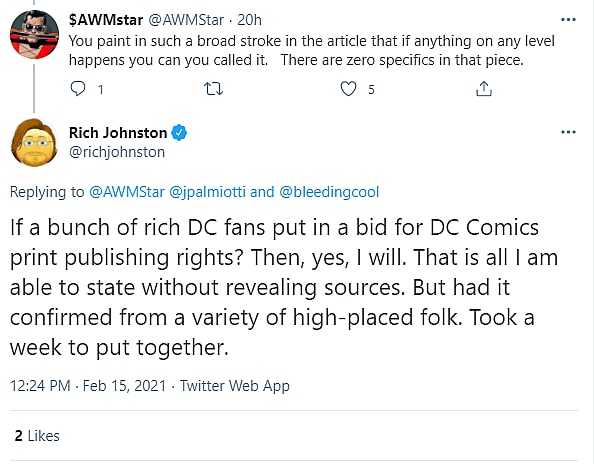 “If a bunch of rich DC fans put in a bid for DC Comics print publishing rights? Then, yes, I will,” he wrote. “That is all I am able to state without revealing sources. But had it confirmed from a variety of high-placed folk. Took a week to put together.”