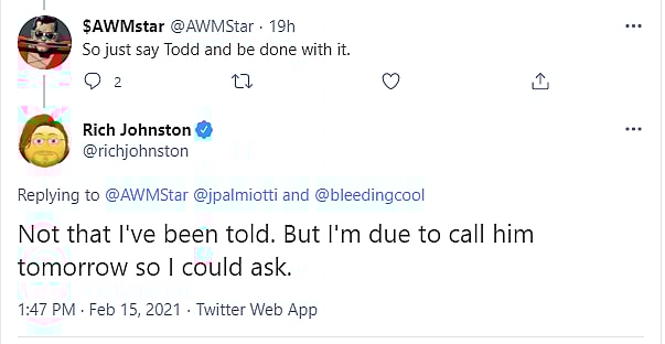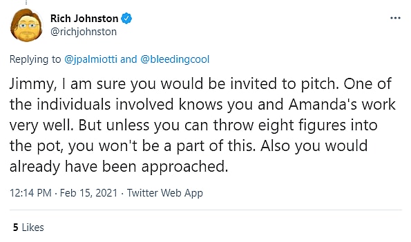 “Jimmy, I am sure you would be invited to pitch. One of the individuals involved knows you and Amanda’s work very well,” Johnston tweeted back. “But unless you can throw eight figures into the pot, you won’t be a part of this. Also you would already have been approached.”