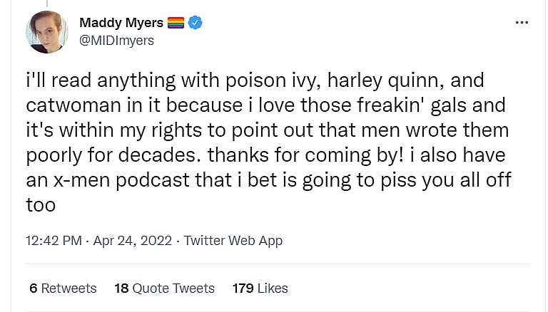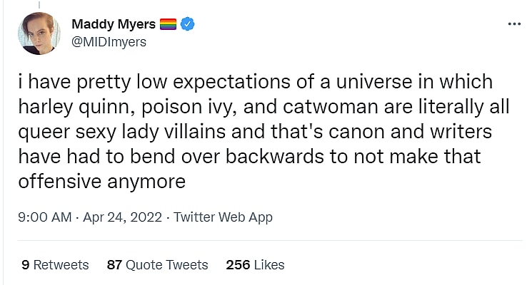 Myers then stated, “i have pretty low expectations of a universe in which harley quinn, poison ivy, and catwoman are literally all queer sexy lady villains and that’s canon and writers have had to bend over backwards to not make that offensive anymore.”