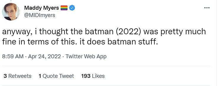 In a follow-up tweet, Myers added, “anyway, i thought the batman (2022) was pretty much fine in terms of this. it does batman stuff.”