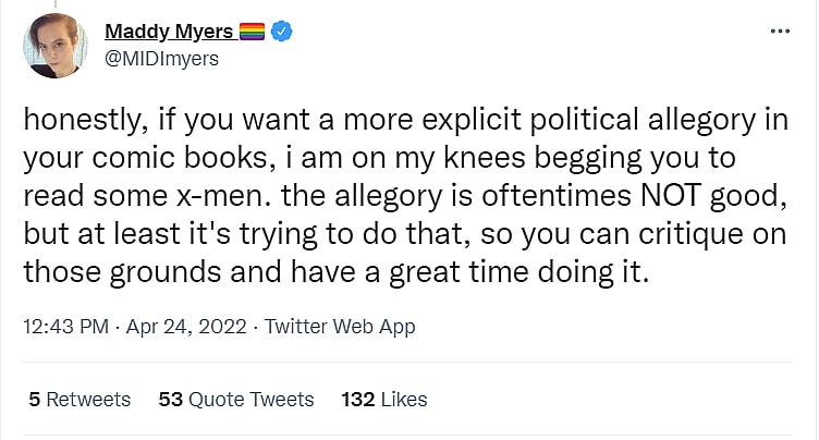 Directing the thread towards the X-Men, Myers tweeted, “honestly, if you want a more explicit political allegory in your comic books, i am on my knees begging you to read some x-men.”