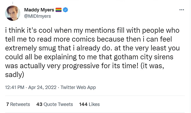 The Polygon editor then wrote, “i think it’s cool when my mentions fill with people who tell me to read more comics because then i can feel extremely smug that i already do. at the very least you could all be explaining to me that gotham city sirens was actually very progressive for its time! (it was, sadly)”