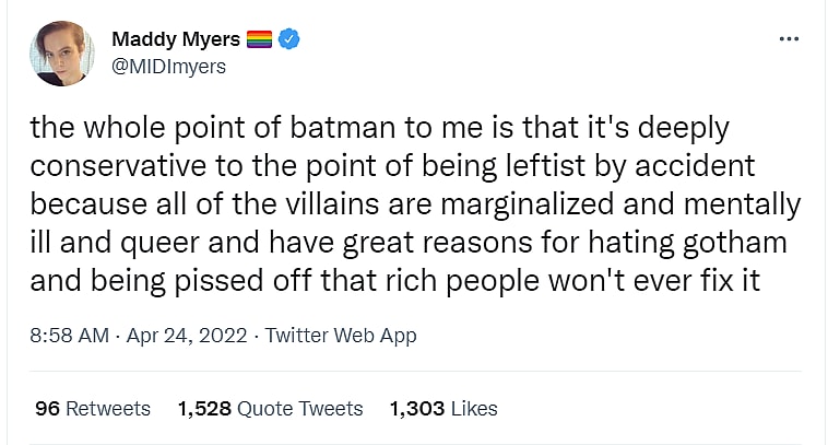 Myers made her opinion clear on the matter in a series of tweets that began, “the whole point of batman to me is that it’s deeply conservative to the point of being leftist by accident because all of the villains are marginalized and mentally ill and queer and have great reasons for hating gotham and being pissed off that rich people won’t ever fix it.”