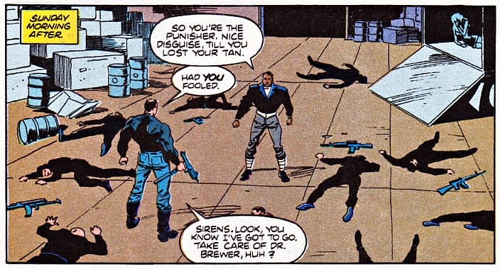 In 1991, under the direction of storied Punisher writer Mike Baron, Frank found himself in need of a disguise following a razor-thin escape from prison following a brutal beating at the hands of Jigsaw and his goons.