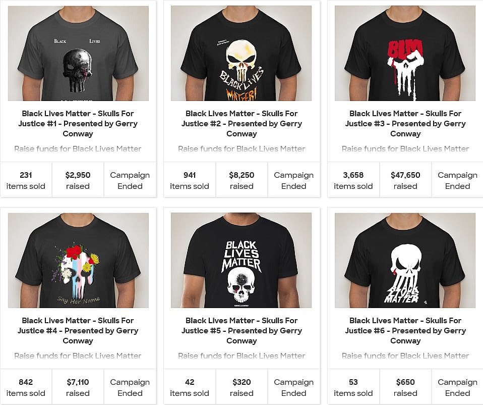 “And putting out sweatshirts that, or T-shirts, you know, that had the BLM logo with The Punisher logo is a, you know, it’s a pretty hefty “F- you” to people who deserve to have an ‘F- you,’” he added, referencing the Black Lives Matter – Skulls for Justice campaign he launched last June.