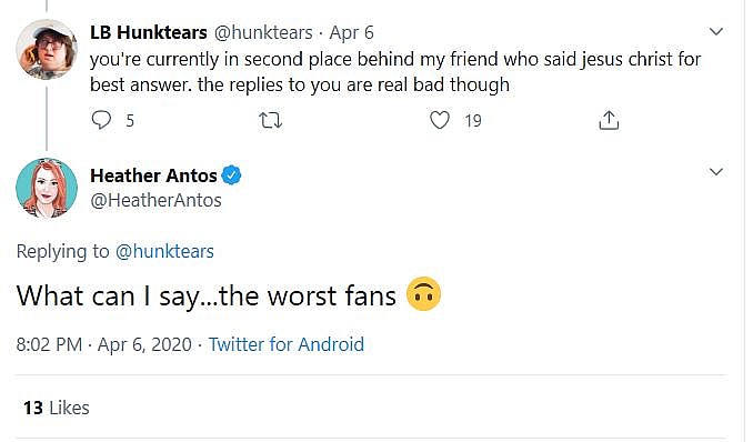 In response to a Twitter user asking “what thing has the worst fans,” Antos replied, “America.”