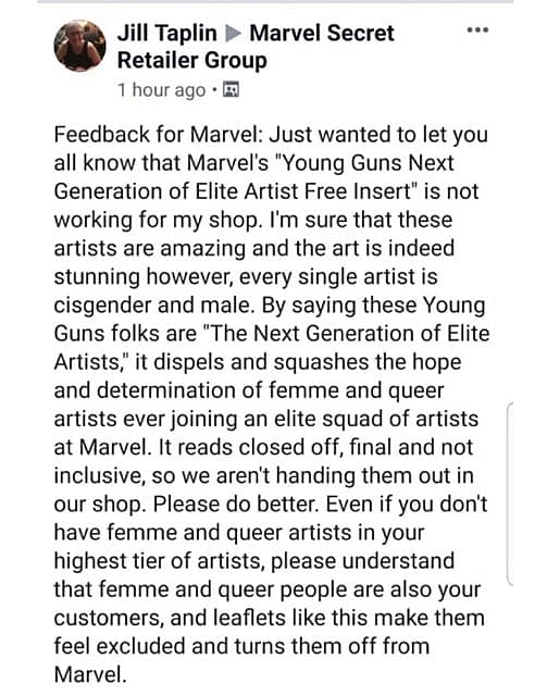 The retailer, Jill Taplin the CEO and founder of Outsider Comics & Geek Boutique in Seattle, Washington, goes on to state that “By saying these Young Guns folks are “The Next Generation of Elite Artists,” it dispels and squashes the hope and determination of femme and queer artists ever joining an elite squad of artists at Marvel.” Taplin continues, “It reads closed off, final and not inclusive.”