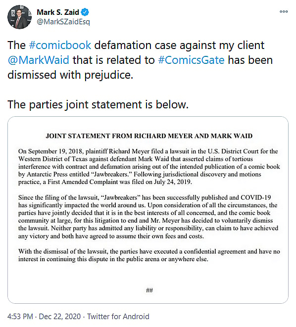 Richard C. Meyer has announced that he will “voluntarily dismiss” his tortious interference and defamation lawsuit against Mark Waid, concluding the months long legal battle that polarized the comic book community.