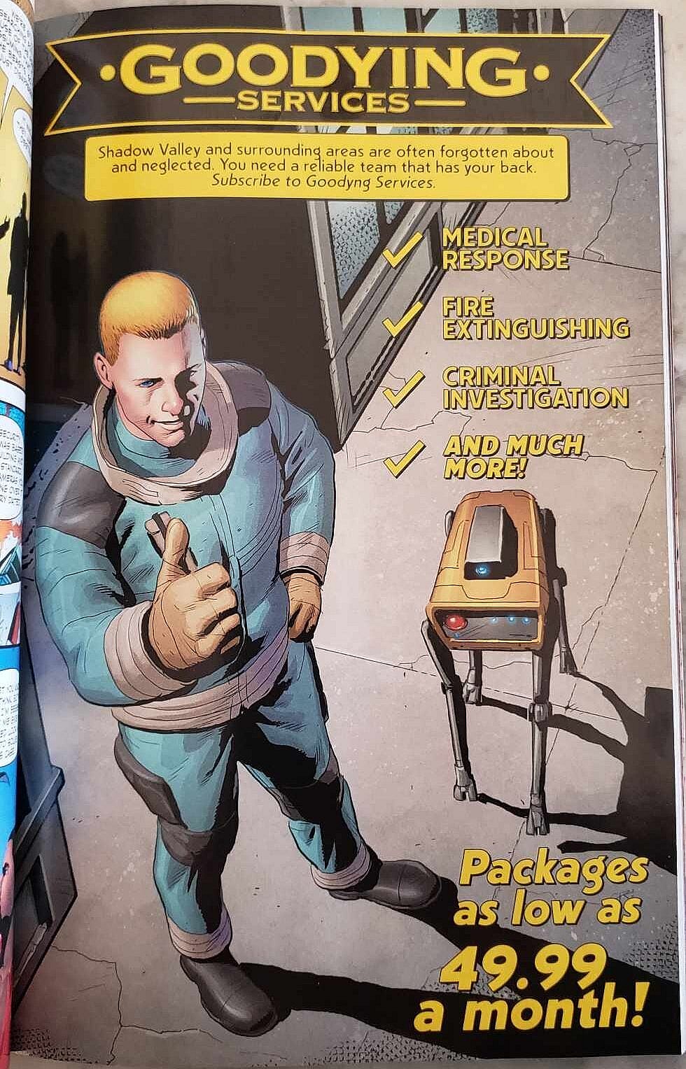 Goodyng is a character that played a prominent role in the recently released Isom #2. The character runs his own private business called Goodyng Services that provides a number of various services from medical response, fire extinguishing, criminal investigation, and more.