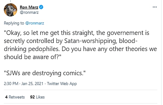 He added, “Okay, so let me get this straight, the government is secretly controlled by Satan-worshipping, blood-drinking pedophiles. Do you have any other theories we should be aware of?’”