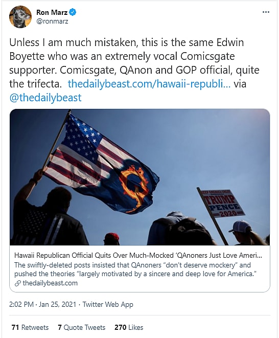Marz shared an article from Daily Beast covering Boyette’s resignation writing, “Unless I am much mistaken, this is the same Edwin Boyette who was an extremely vocal Comicsgate supporter. Comicsgate, QAnon and GOPP official, quite the trifecta.”