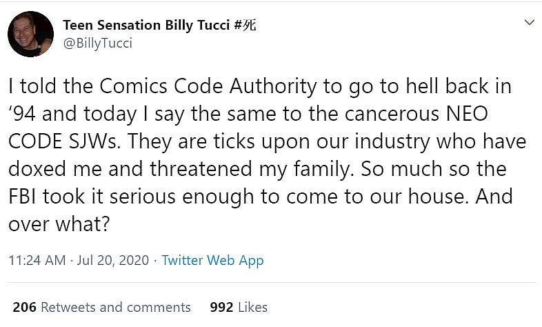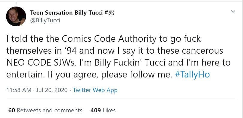 Tucci continued in another tweet, “I told the Comics Code Authority to go f*** themselves in ’94 and now I say it to these cancerous NEO CODE SJWs. I’m Billy F***** Tucci and I’m here to entertain. If you agree, please follow me. #TallyHo“