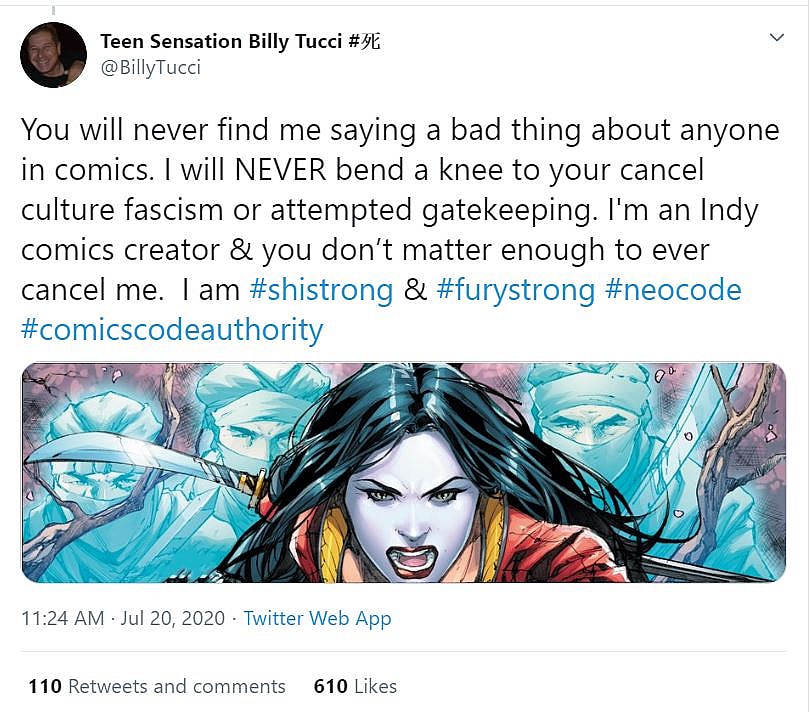 Shi creator and Miss Fury writer Billy Tucci took to Twitter to tell the “Neo Code SJWs” to go to hell.