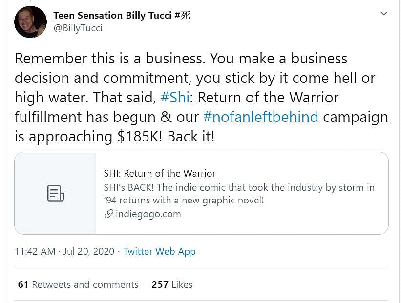 He added ,”That said, #Shi: Return of the Warrior fulfillment has begun & our #nofanleftbehind campaign is approaching $185K! Back it!”