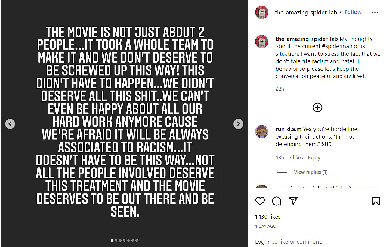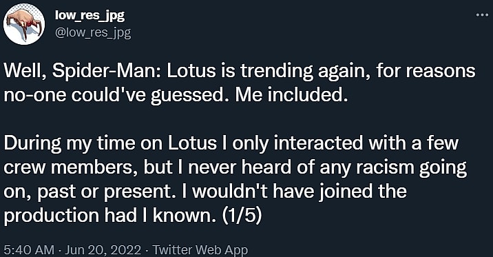 “Well, Spider-Man: Lotus is trending again, for reasons no-one could’ve guessed. Me included,” quipped @low_res_jpg. “During my time on Lotus I only interacted with a few crew members, but I never heard of any racism going on, past or present. I wouldn’t have joined the production had I known.”