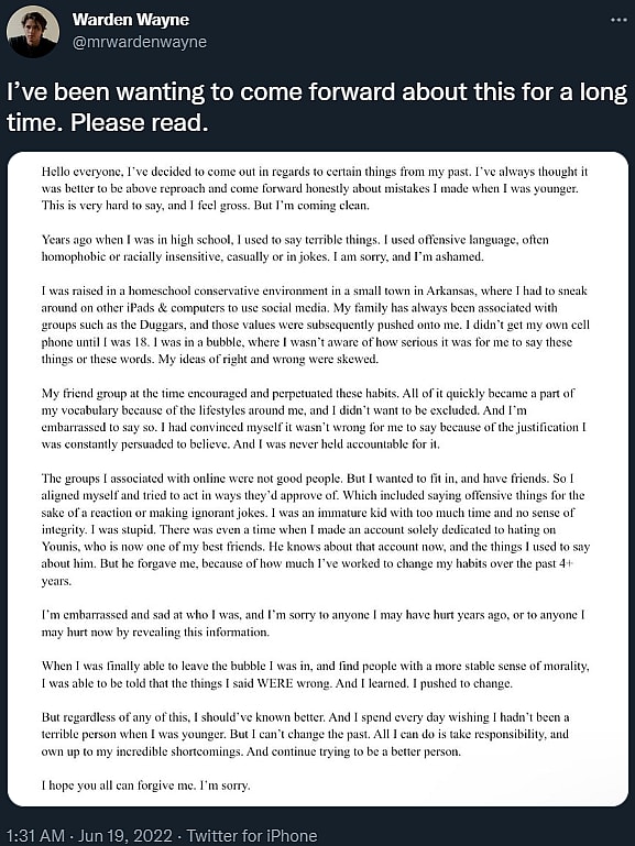 “I was raised in a homeschool conservative environment in a small town in Arkansas, where I had to sneak around on other iPads & computers to use social media,” Wayne continued. “My family has always been associated with groups such as the Duggars, and those values were subsequently pushed onto me. I didn’t get my own cell phone until I was 18. I was in a bubble, where I wasn’t aware of how serious it was for me to say these things or those words. My ideas of right and wrong were skewed.”