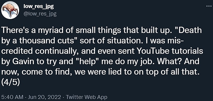 “There’s a myriad of small things that built up. ‘Death by a thousand cuts’ sort of situation,” they said. “I was mis-credited continually, and even sent YouTube tutorials by Gavin to try and ‘help’ me do my job. What? And now, come to find, we were lied to on top of all that.”