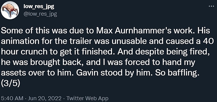To this, @low_res_jpg alleged, “Some of this was due to Max Aurnhammer’s work. His animation for the trailer was unusable and caused a 40 hour crunch to get it finished. And despite being fired, he was brought back, and I was forced to hand my assets over to him. Gavin stood by him. So baffling.”