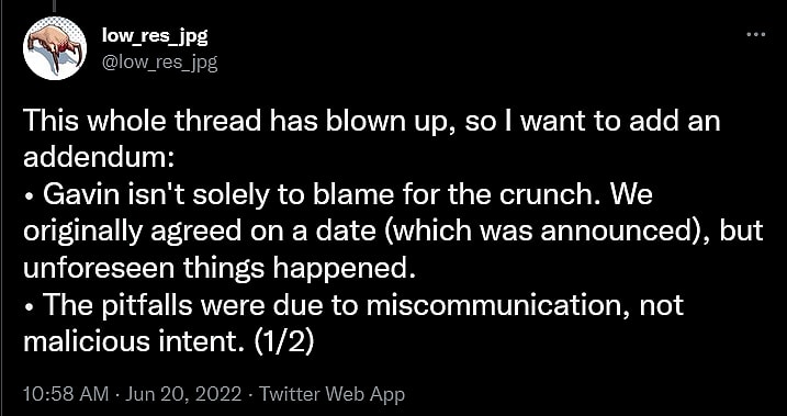 @low_res_jpg later added that Konop was not the sole reason to blame for the crunch as “unforeseen things happened” and clarified that “the pitfalls were due to miscommunication, not malicious intent.”