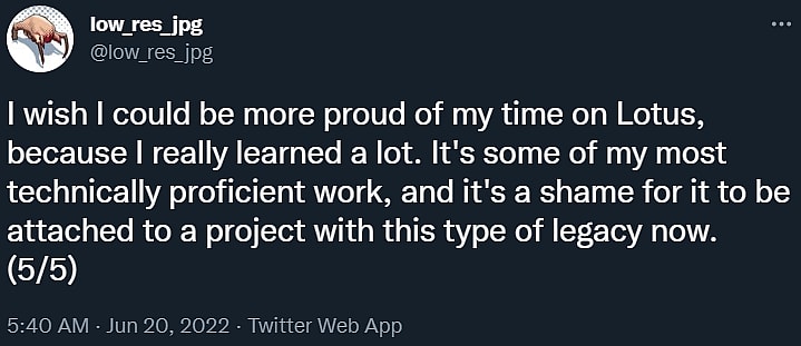 A dismayed @low_res_jpg soon admitted, “I wish I could be more proud of my time on Lotus, because I really learned a lot. It’s some of my most technically proficient work, and it’s a shame for it to be attached to a project with this type of legacy now.”
