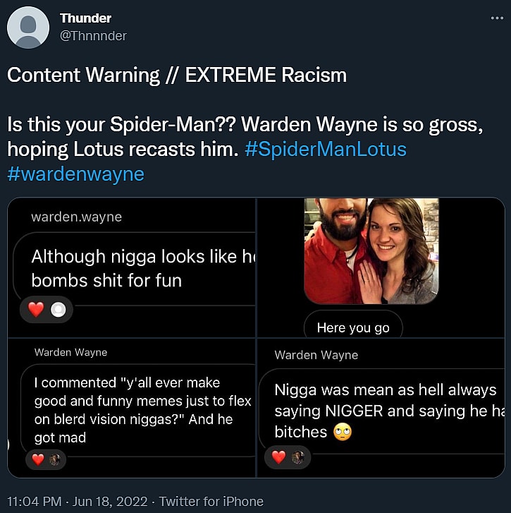 Then, on June 18th, Twitter user @Thnnnder took to the social media platform to expose what they alleged were several racist private Instagram messages they had received from Warden Wayne, the actor playing Spider-Man: Lotus’ titular web-head.