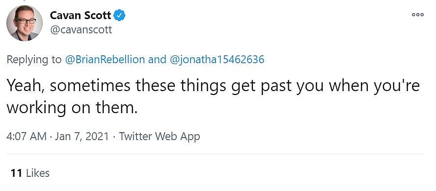 In a separate tweet Scott would write, “Yeah, sometimes these things get past you when you’re working on them.”