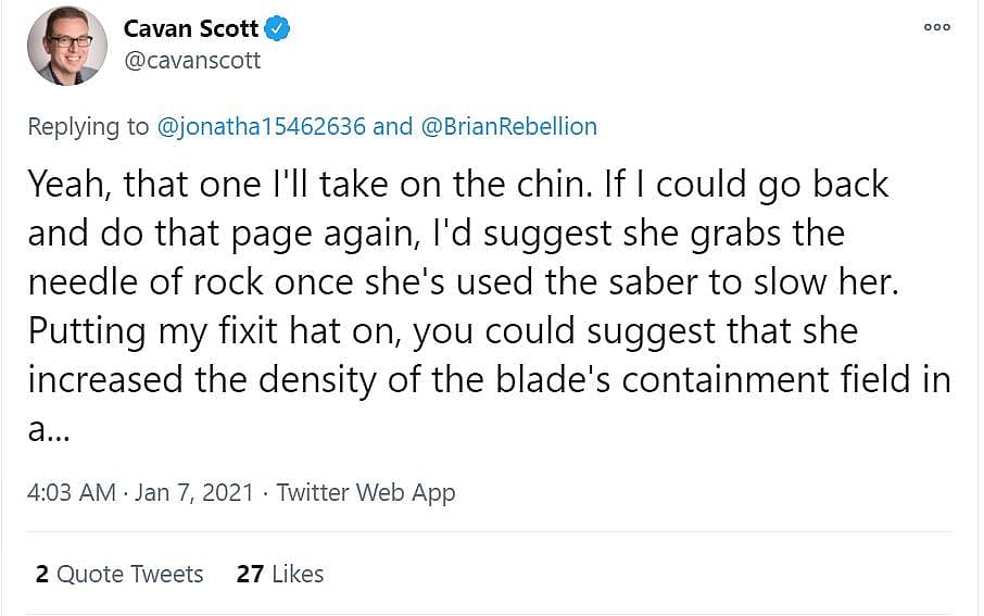 He explained, “If I could go back and do that page again, I’d suggest she grabs the needle of rock once she’s used the saber to slow her.”
